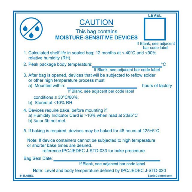| Beschrijving | LABEL MOISTURE WARN 4"X4" 100PC | Leid Free Status / RoHS Status | Niet van toepassing / Niet van toepassing |